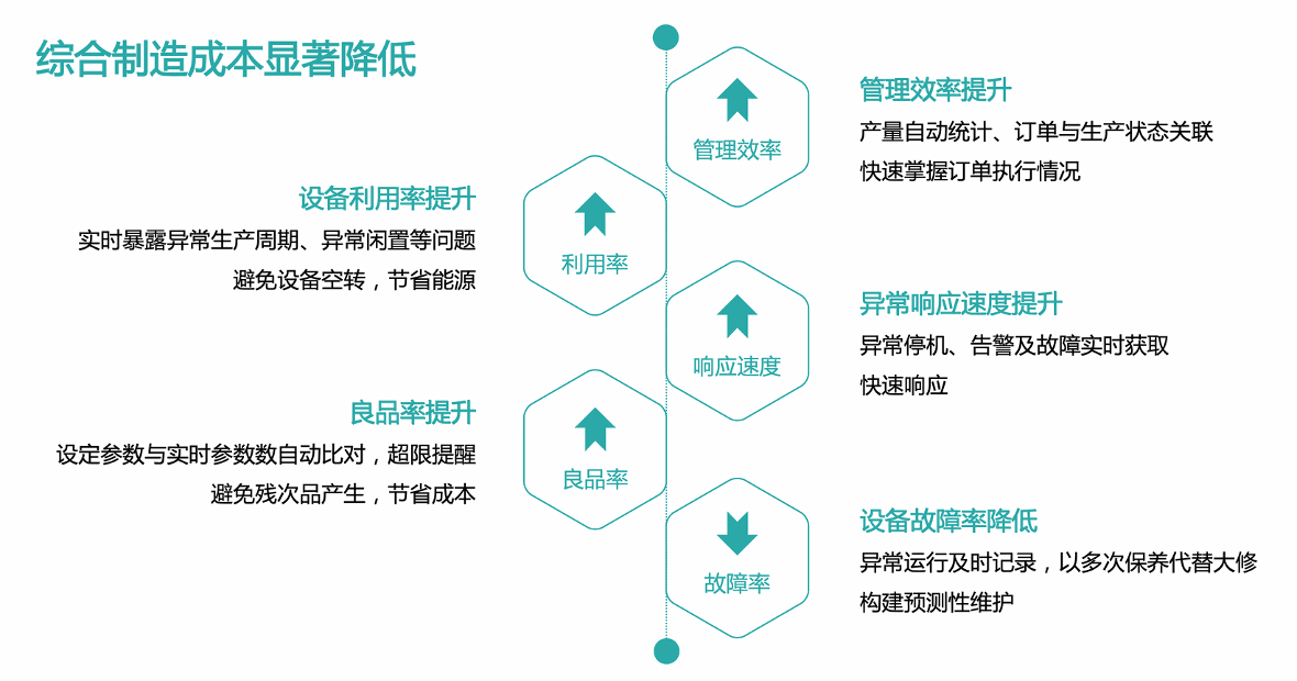 结合设备数据与生产数据,可实现设备稼动率管理、订单达成率管理、质量工艺管理、设备智能维保等功能。